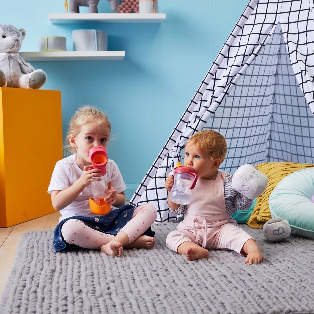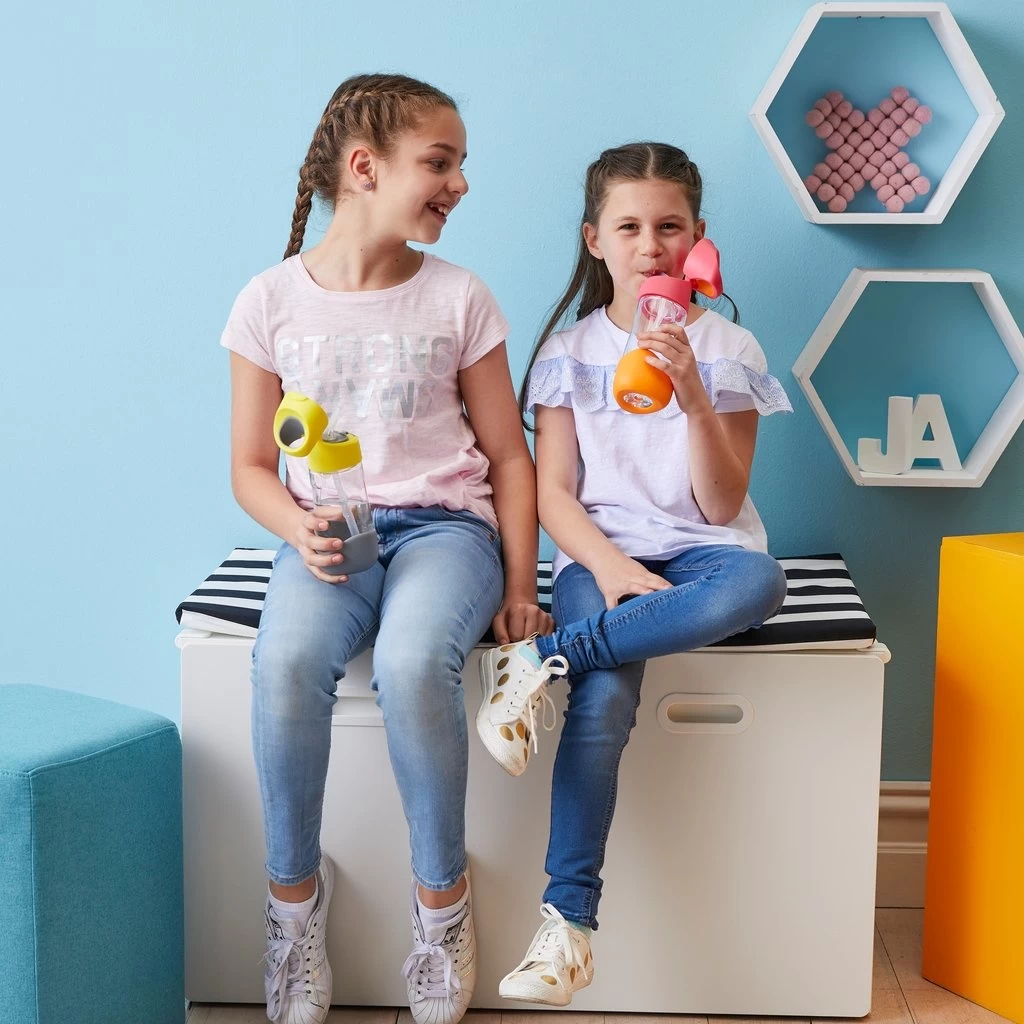 Made from tritan™, our unique big kids’ drink bottle is ideal for kindy and school kids. Its unique triangle shape bottle is designed specifically for little hands, making it easier for kids to grip. Easy push button pops open the lid, keeping straw tops hygienic when closed and never goes astray. Spill-proof bite valve straw top prevents accidental spills. Robust carry handle makes it easy for kids to carry and remove out of school bags. Its 450ml capacity and angled silicone straw lets kids drink to the very last drop and stay hydrated throughout the day. Minimal parts and ultra easy to assemble / disassemble and clean. Dishwasher safe. Plus, customise the look with removable bumper