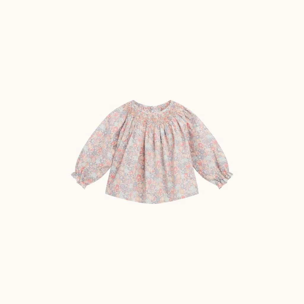 A stunning Liberty floral print, a smocked neckline and ruffled cuffs: the Liberty print Griotte blouse has it all. This cotton garment slips on easily thanks to its entirely buttoned back.