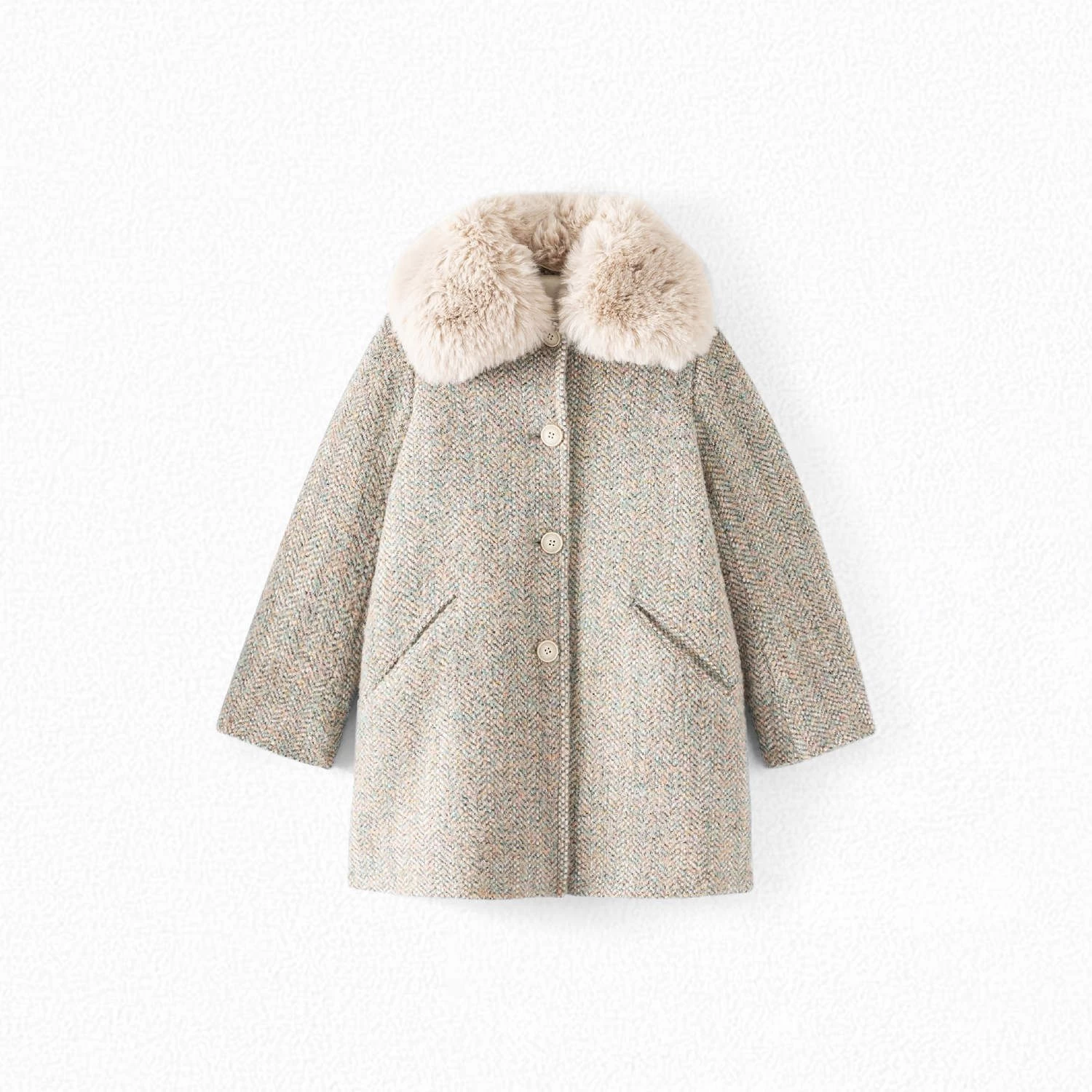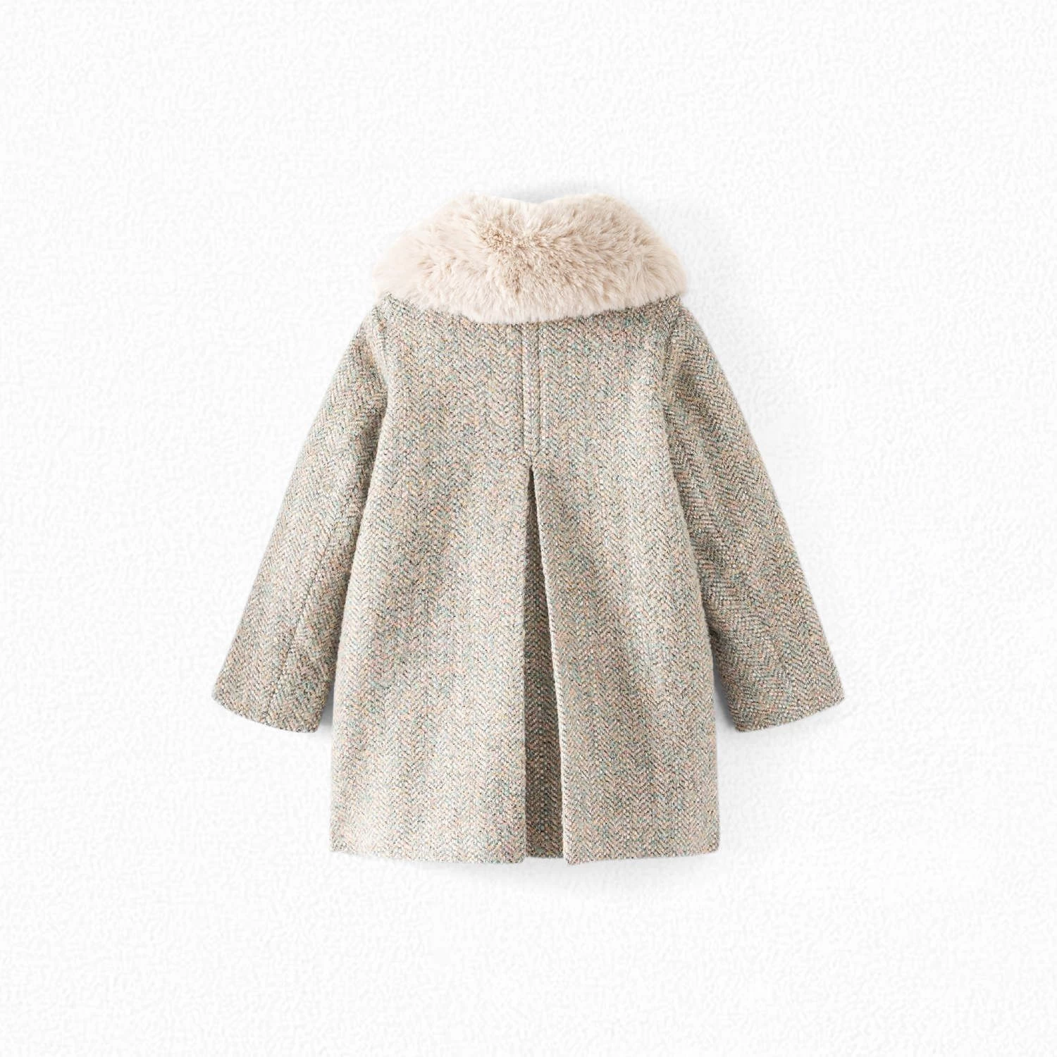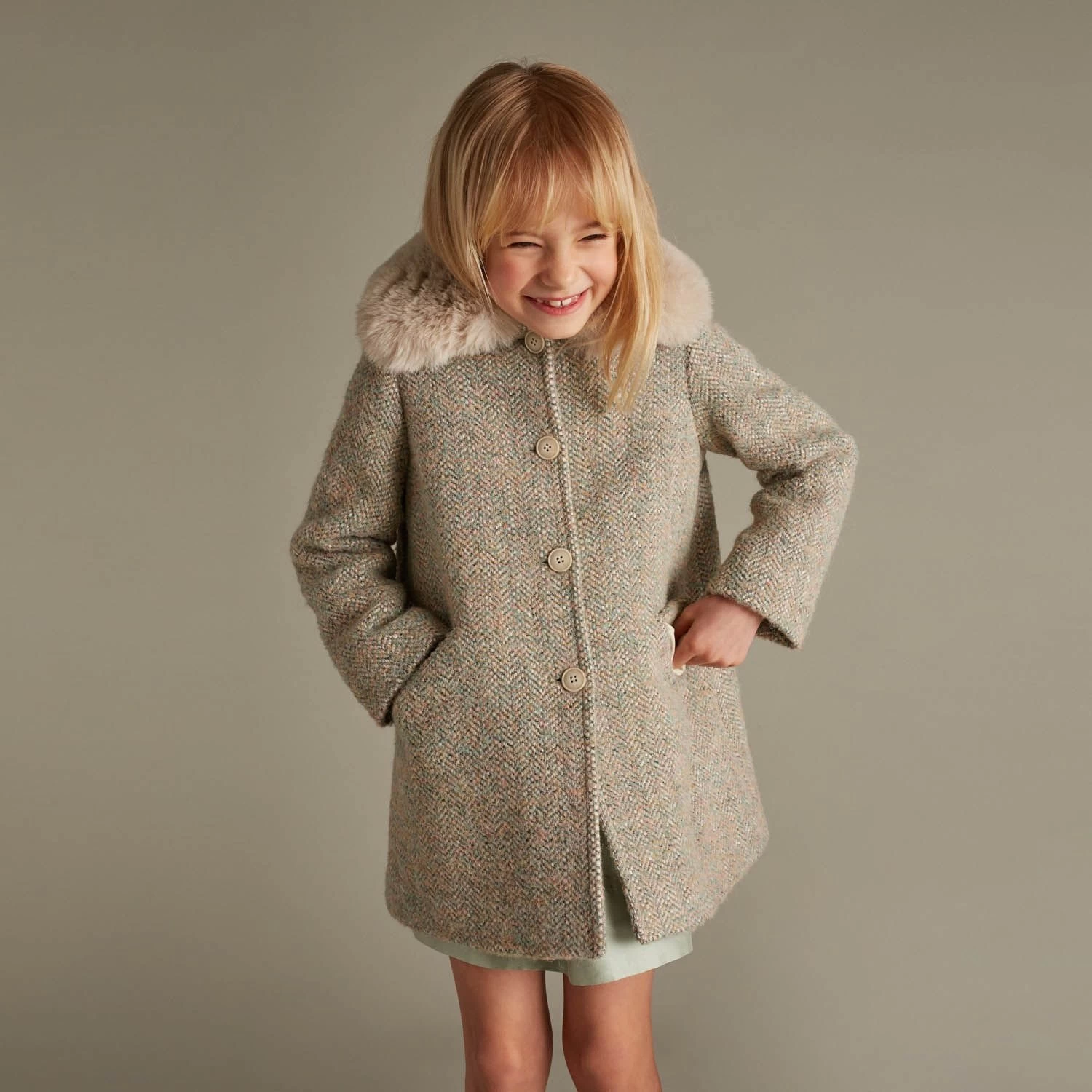 Description: The Maggie girls’ coat features an elegant faux fur collar and a jacquard lining adorned with the exclusive Bonpoint cherry motif. This iconic House design is made of soft, luminous tweed material.