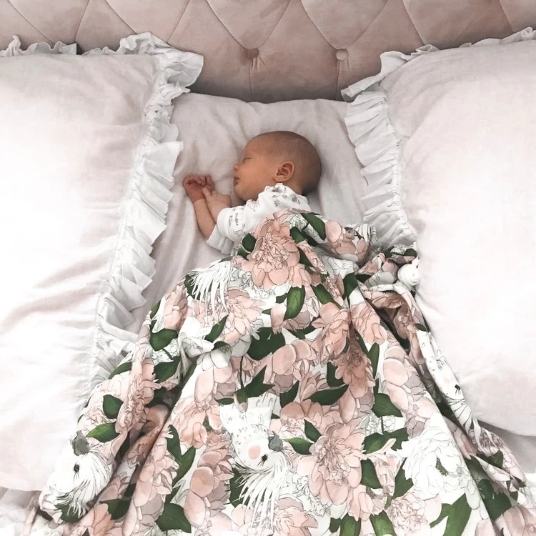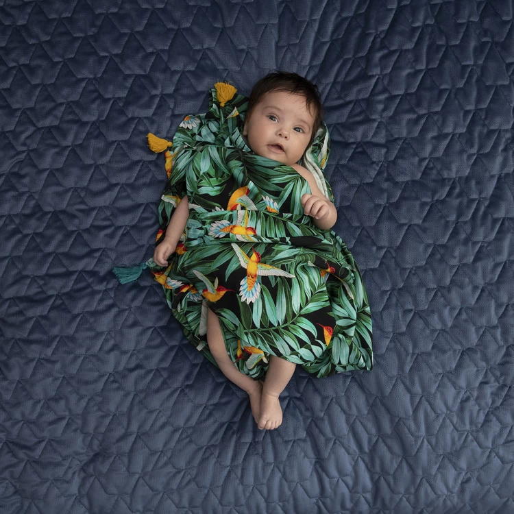 The bamboo swaddle is perfect for the summer and so much more. The colors of the fringing might differ from the ones in the pictures.