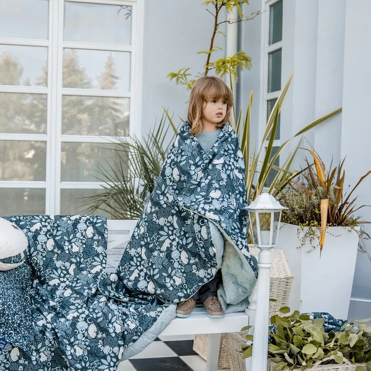 A two-sided blanket: one side is made of soft, high-quality cotton that works exceptionally well with a soft coloured minky of your choice. Filled with antiallergenic silicone fabric, making it very lightweight, as well as extra warm. Can be used as a cover for the mandatory, everyday nap and walk, or, due to its large size – as a bedsheet. The quality materials let you wash it as often as needed while making the product resistant to usual wear and tear.
