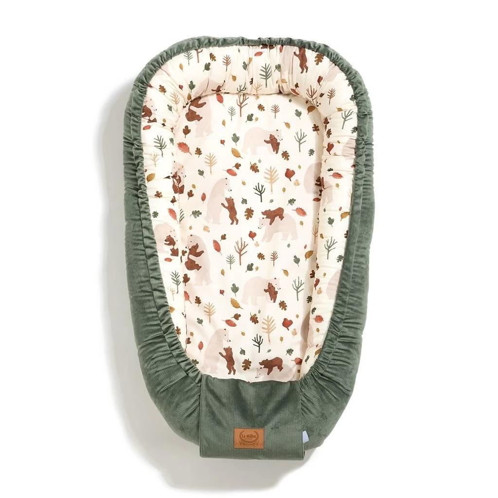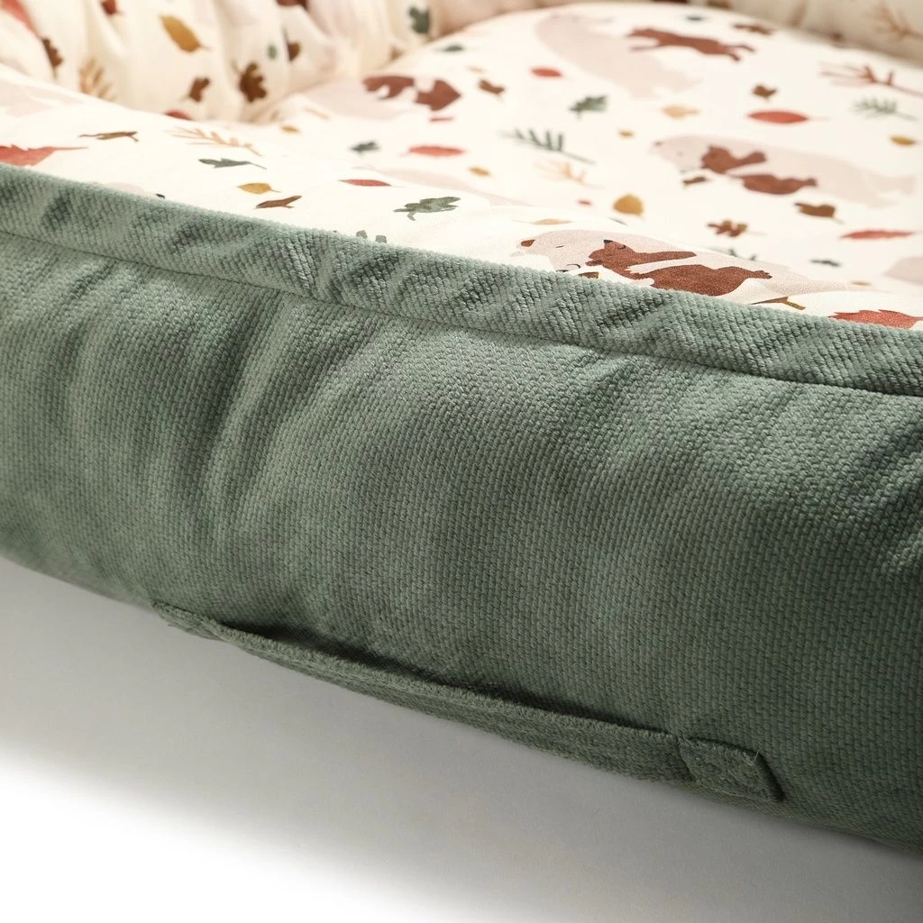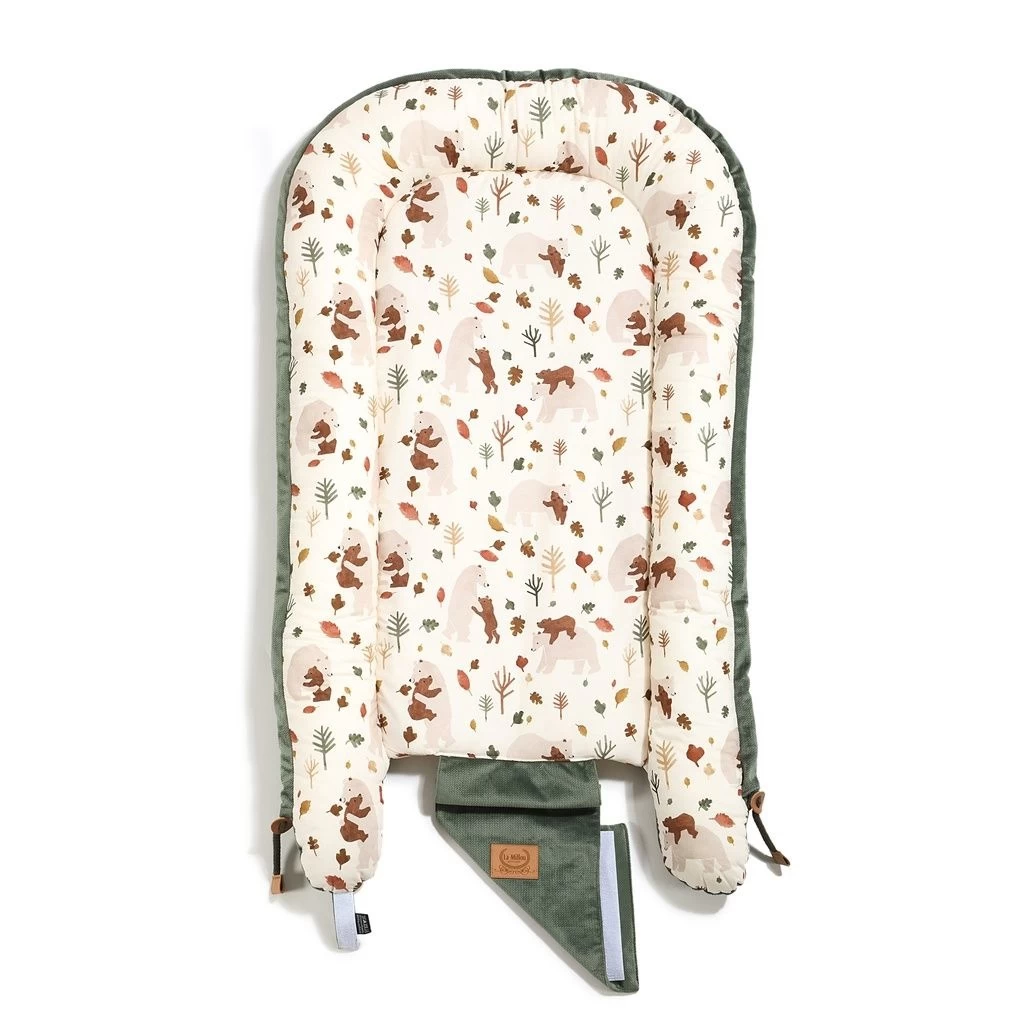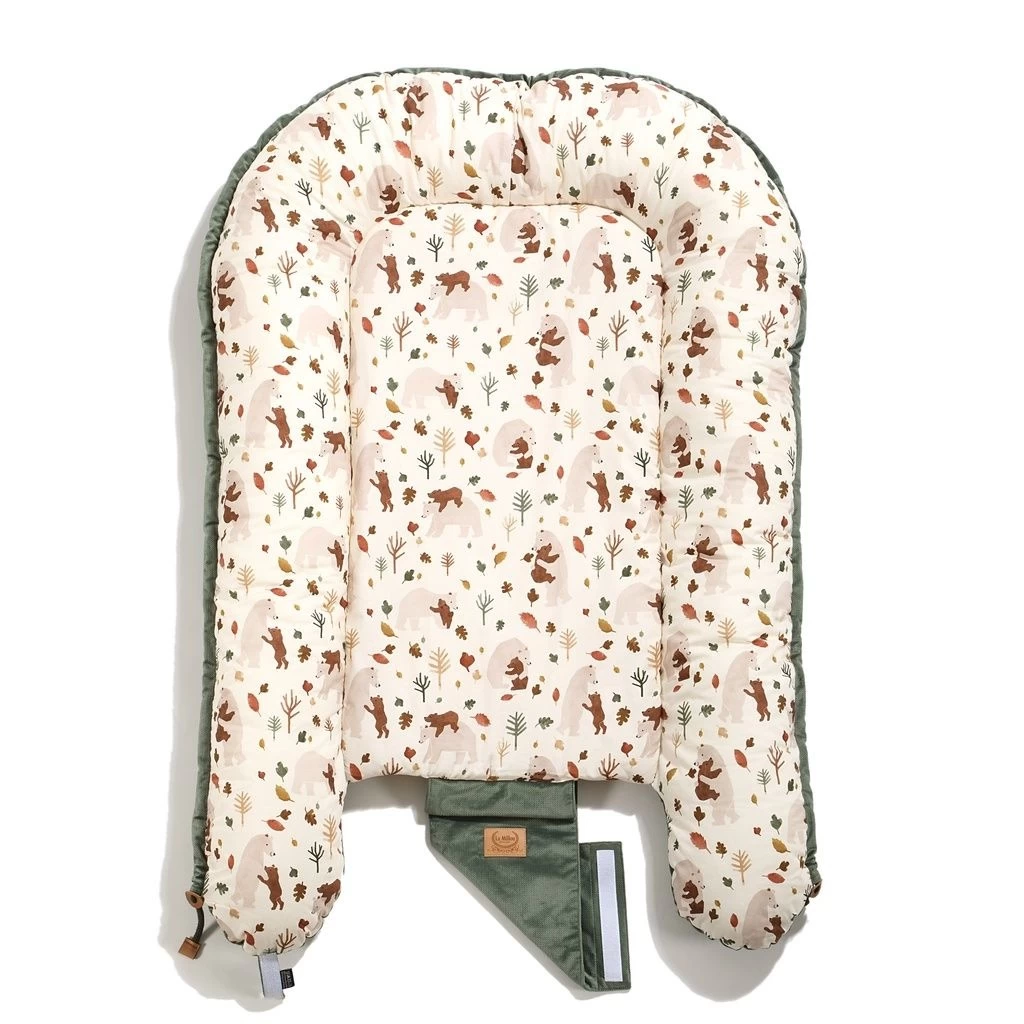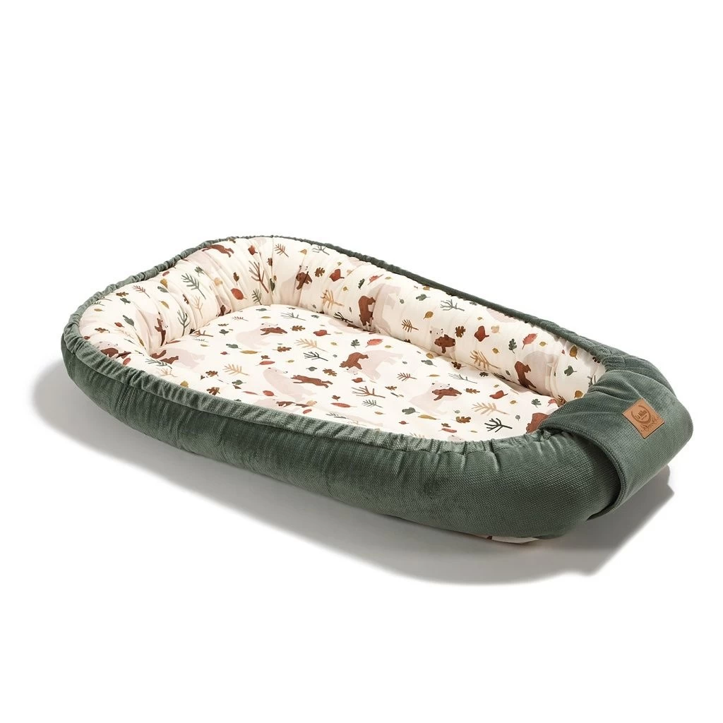 A multifunctional baby cocoon created out of love for children: so that the baby always has his own, friendly place to play, sleep and rest under the watchful eye of the parent. Lying in a cocoon, the baby can spend time with his parent, accompanying him during various activities, such as work, resting on the couch, bathing and even during outdoor activities. Ideally suited to travel, babies sometimes hardly endure foreign places, a new environment, thanks to our cocoon, the child can always have a place to relax with him. The inner part of the sides and the bottom are made of breathable cotton, and the outer part is made of a soft and air-permeable elegant velvet. The sides are filled with a soft, anti-allergic silicone ball. We sew an elastic fleece into the bottom of the cocoon, thanks to which the cocoon can be washed in the washing machine without the risk of moving. The cocoon can be tightened at the bottom with a string, which allows easy size adjustment. In the case of older children, the product can be solved, thanks to which a friendly play zone is created that does not restrict the movements of the legs. The drawstring is additionally secured with a tab, making it completely safe for the child. Our cocoons come in two sizes: Normal and Grande. The Normal version is more handy, it fits perfectly even in smaller beds or attachments to the parents’ bed. The Grande version (when pulled down at the bottom) fits in beds from 60cmx120 cm, and after unfolding the fastener at the bottom, the cocoon will be a cozy place to play and relax even for a few years old. NOTE: The baby cocoon cannot be used as a carrier, it is not allowed to carry a baby in it. The product should be used under the supervision of an adult.